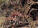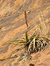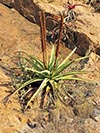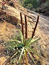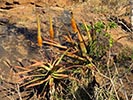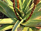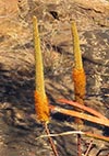 Aloe sessiliflora - Stem stout, erect, usually less than I m high, sometimes branched. Mature leaves spreading horizontally or recurved, up to 60 cm long x 10 cm wide, usually (in open situations) reddish above, green below, margin red with small reddish teeth c 1 cm apart. Inflorescence unbranched, 1—1,3 m long, with few broad pale membranous bracts below raceme; flowers very numerous, closely set, ginger-coloured, striped; perianth c 1,5 cm long, segments free to base; stamens protruding; bracts scaly and conspicuous especially among unopened flowers.