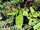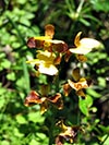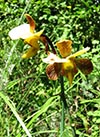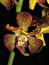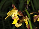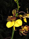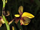 Eulophia streptopetala - Sometimes reaching 2,3 m high. Leaves up to 60 cm long x 8 cm wide with prominent veins, tapering to long narrow point. Inflorescence axis stiffly erect, with few loosely sheathing bracts not overlapping one another. Flowers loosely set on axis, spreading. Sepals dark greenish-brown, mottled, c 2 cm long, reflexed. Petals yellow, almost circular, c 2 cm diam. Lip about same length and width, end lobe forked, side lobes spreading widely.