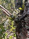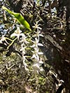 Mystacidium capense - Leaves up to four, reaching 6 cm long x I cm wide at middle, usually smaller. Inflorescence axis slender, 8 cm long or less, with up to ten well-spaced scented flowers; bracts c 3 mm long; perianth white, sepals c 6 mm long x 3 mm wide, petals rather smaller; spur up to 3,5 cm long, very slender, usually bent and standing away from axis.