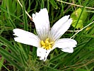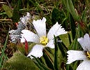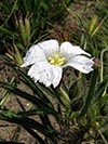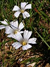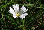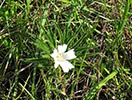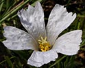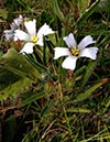 Monsonia attenuata - Erect little-branched or tufted with somewhat tuberous rootstock, densely leafy, up to 30 cm high, loosely hairy and glandular throughout. Leaf-stalk slender, c 1,5 cm long; blade usually many times longer than broad, margin finely toothed, c 6 cm longx 6 mm wide, tapering to pointed tip. Flowers borne singly, erect at top of shoot, stalk c 4 cm long; sepals separate, narrow, c 1,5 cm long, tips with long slender point; petals white, with strong network of dark veins, up to 3 cm long.