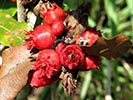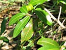 Ochna natalitia - (Isifubasangala) Small tree often dwarfed, hairless throughout. Stems round with numerous pale lenticels. Leaf-stalk c 2 mm long; blade usually lance-shaped, tapering to blunt tip but not to stalk, distInctly toothed, c 8 cm long x 2 cm wide. Inflorescences scented, sometimes elongated at end of lateral short shoots, sometimes of only a few flowers; stalk c 7 mm long; petals yellow, c 7 mm long x 4 mm wide; fruits black, fleshy on bright red thickened base. Plants often have conspicuous red leafy insect-galls.