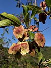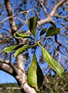Terminalia phanerophlebia - Good-sized tree. Leaves closely placed along stems; stalk distinct, up to 1,5 cm long; blade oval, usually blunt, tapering to base, thinly hairy beneath, especially on veins, up to 7 cm long X 3 cm wide. Jnflorescences slender, loose, up to 5 cm long; flowers white. Fruits broadly winged all round, c 3 cm long x 2,5 cm wide, reddish.