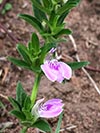Monechma debile - Erect, up to 50 cm high, finely downy, almost velvety, throughout. Leaves on main stem with stalk up to 2 cm long, blade lance-shaped, up to 10 cm long X 2 cm wide. Inflorescences terminal and axillary, up to 7 cm long, with short intervals between flower-clusters; bracts oval, white-hairy. Calyx lobes very slender, glandular, c 7 mm long; corolla white with mauve tint on lower lip, c 8 mm long, downy. Fruit c 5 mm long, downy.