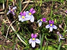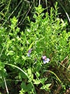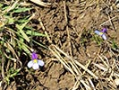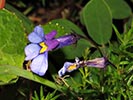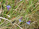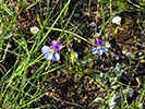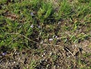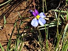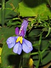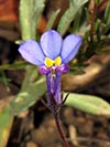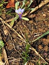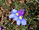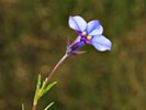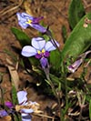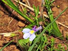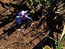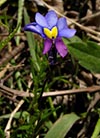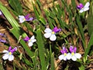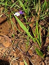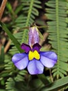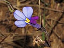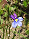 Lobelia decipiens - Slender underground rhizome. Aerial shoots erect, slender, usually less than 20 cm high, minutely downy or hairless. Leaves irregularly scattered, stalkless, narrow-oblong, blunt or pointed, c 1 cm long x 1 mm wide, usually toothless or with occasional minute tooth. Flowers usually few borne at top of leafy shoots, stalk slender, erect, up to 3 cm long. Calyx lobes narrowpointed, spreading, c 4 mm long; corolla minutely downy outside, bright blue, or frequently lower lip blue with yellow spot, upper lip purple. Lower lip with three broad lobes, up to 1,5 cm across; upper lip with two short lobes.